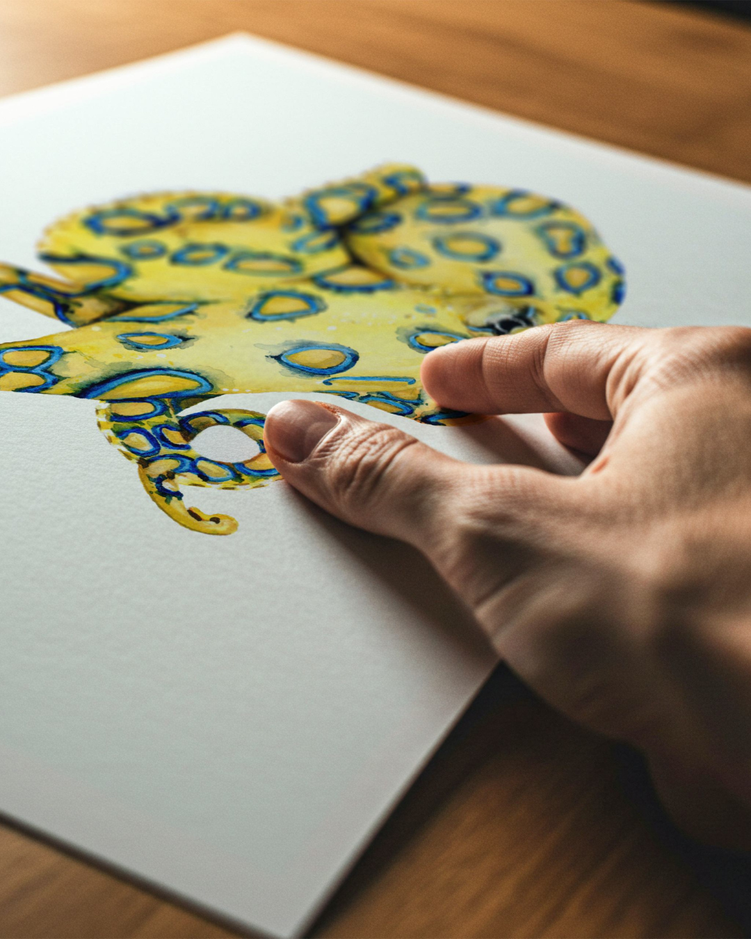 Meet Salty Gold — a bold, glistening octopus painted in rich oils and finished with hand-applied 23ct gold that catches the light like sun on open water.