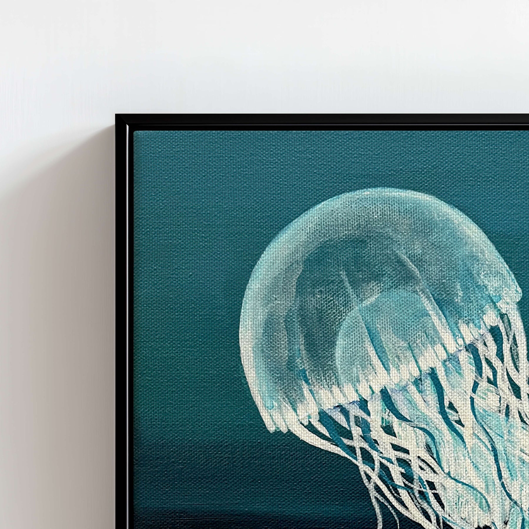It doesn’t just decorate a wall — it transports you. You can almost feel the coolness of the ocean, hear the muffled quiet beneath the surface, and breathe a little deeper. The jellyfish glows softly against a dark backdrop, its tendrils floating like silk — graceful, effortless, endlessly soothing.