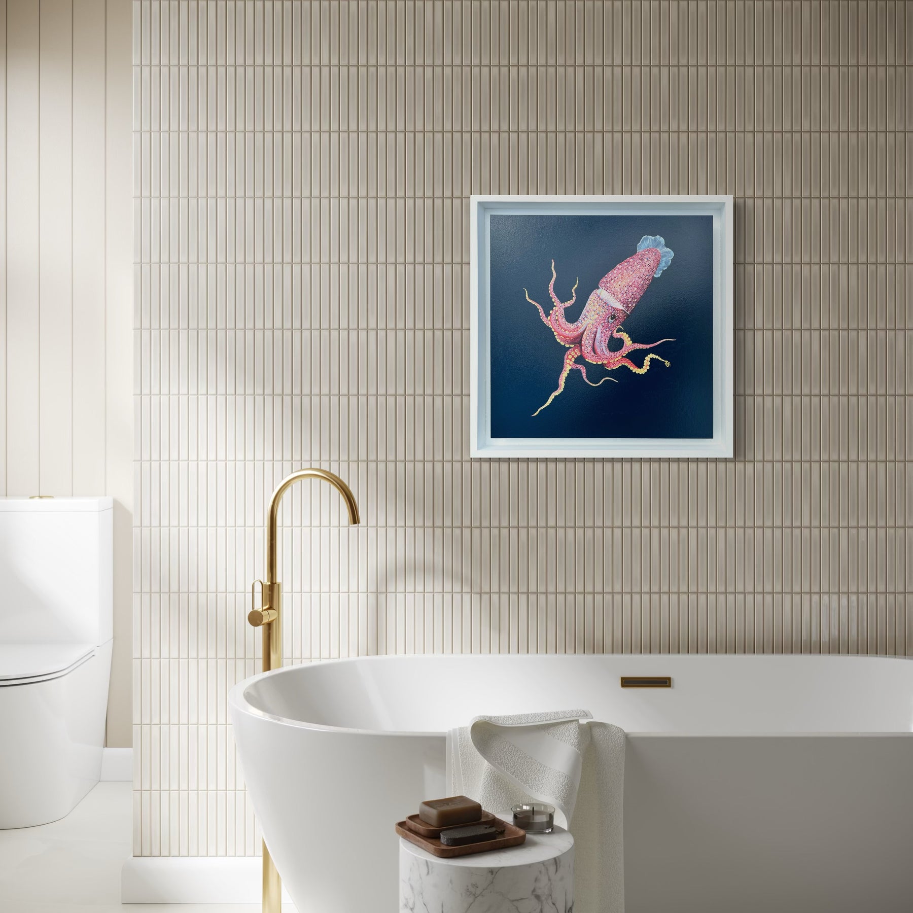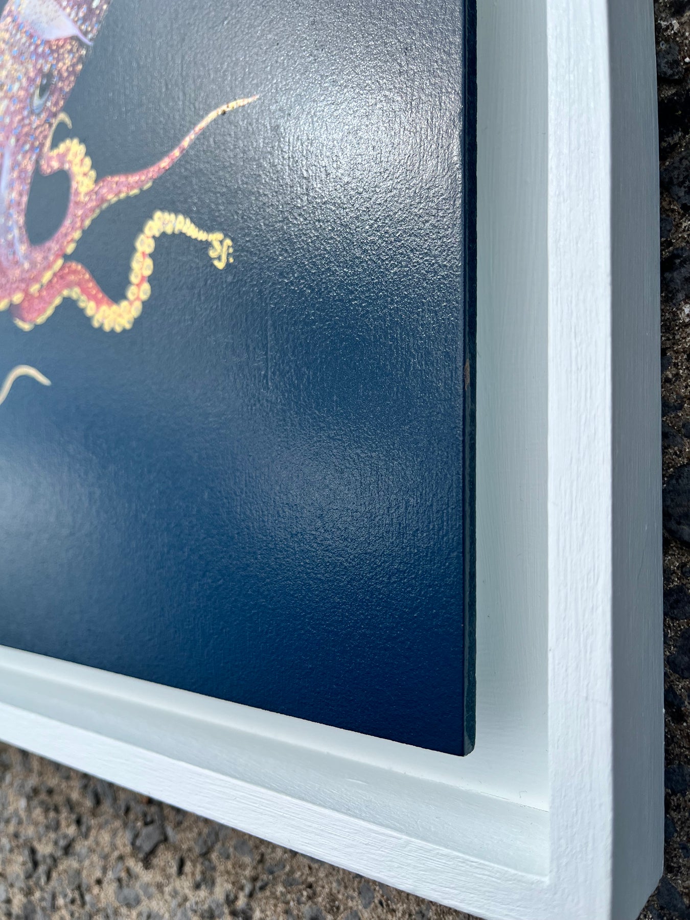 - Striking contrast and depth – The deep navy background and shimmering squid create a mesmerising focal point.
