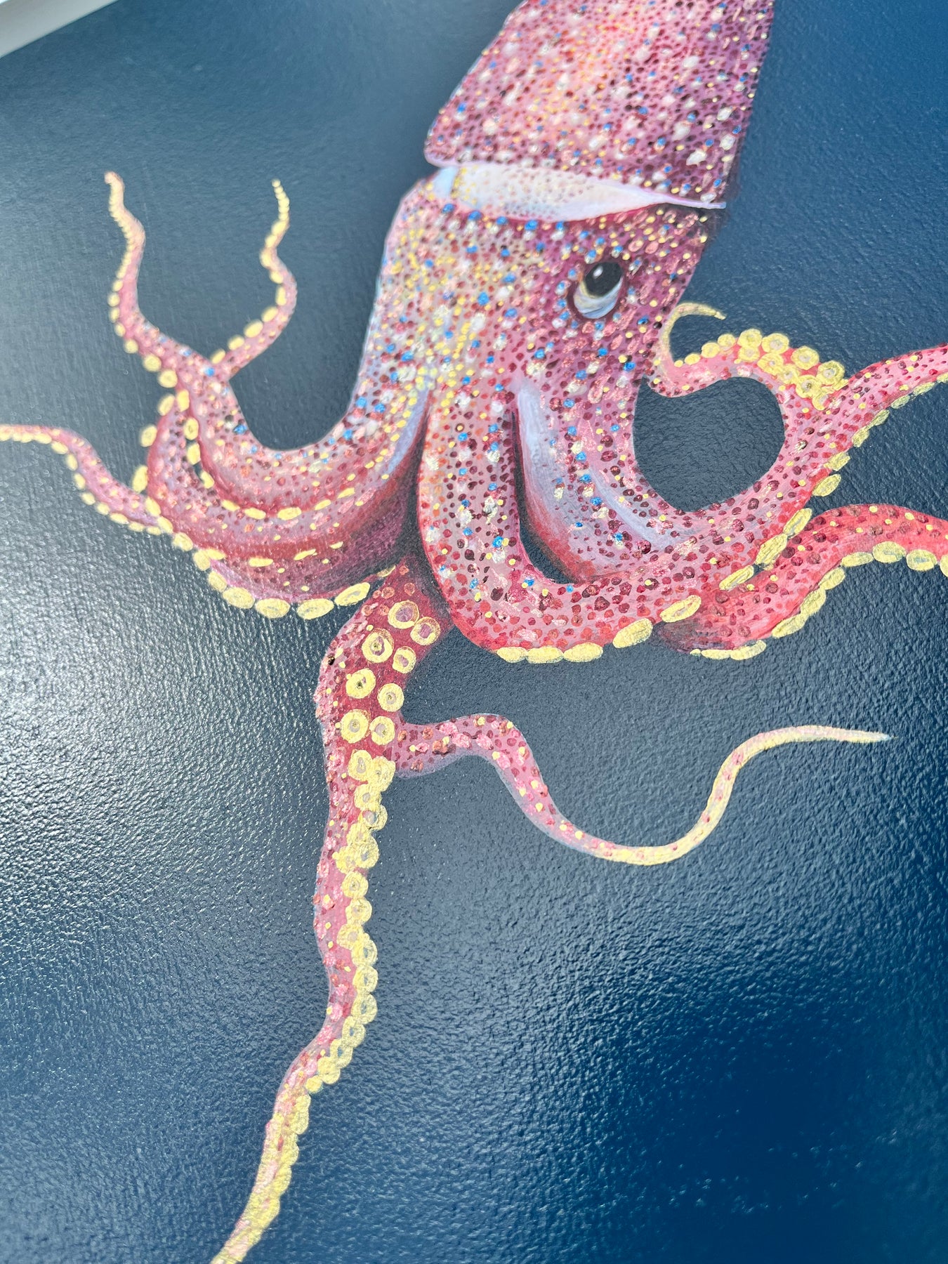 Against a backdrop of rich navy blue, echoing the profound depths of the sea, a vibrant strawberry squid shimmers like a jewel—its luminous presence a captivating contrast to the darkness that surrounds it. With its fluid form and radiant hues, this enigmatic creature dances through the canvas, inviting you into a world both tranquil and untamed.