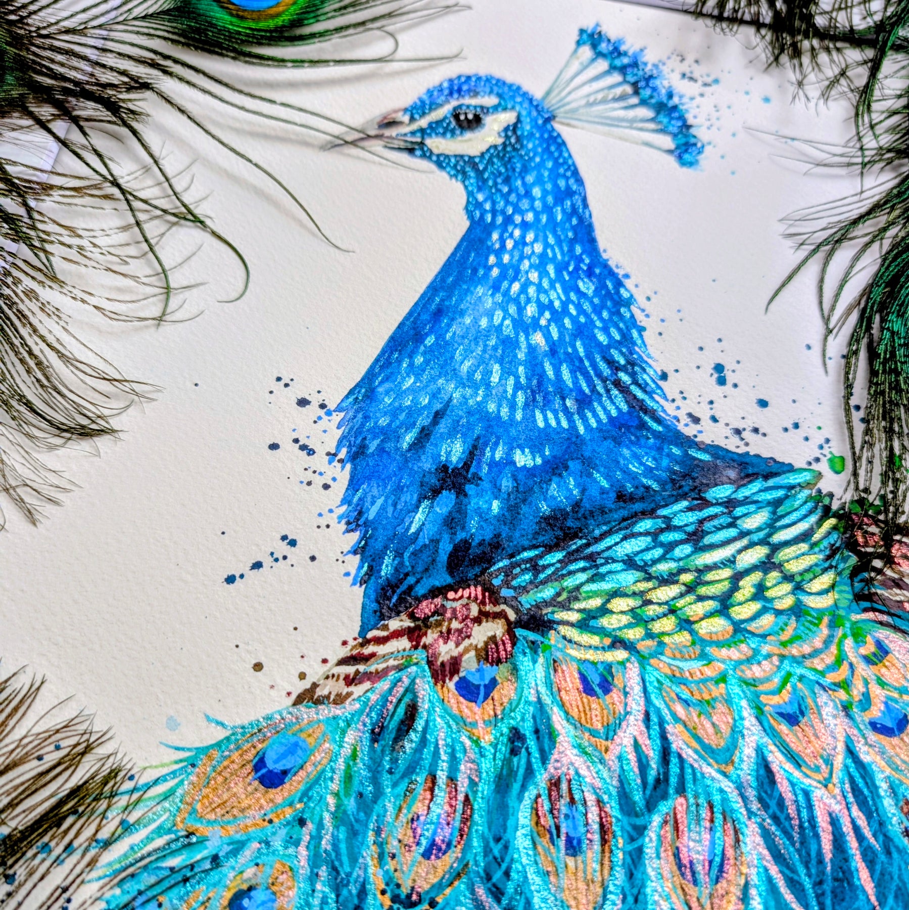 That unmistakable peacock poise, and soft gold detailing shimmer through the plume like a secret he’s half‑willing to share. There’s a touch of mischief in his eye, that famous peacock confidence humming beneath the colours - as if he knows he’s beautiful and enjoys the attention just a little too much.