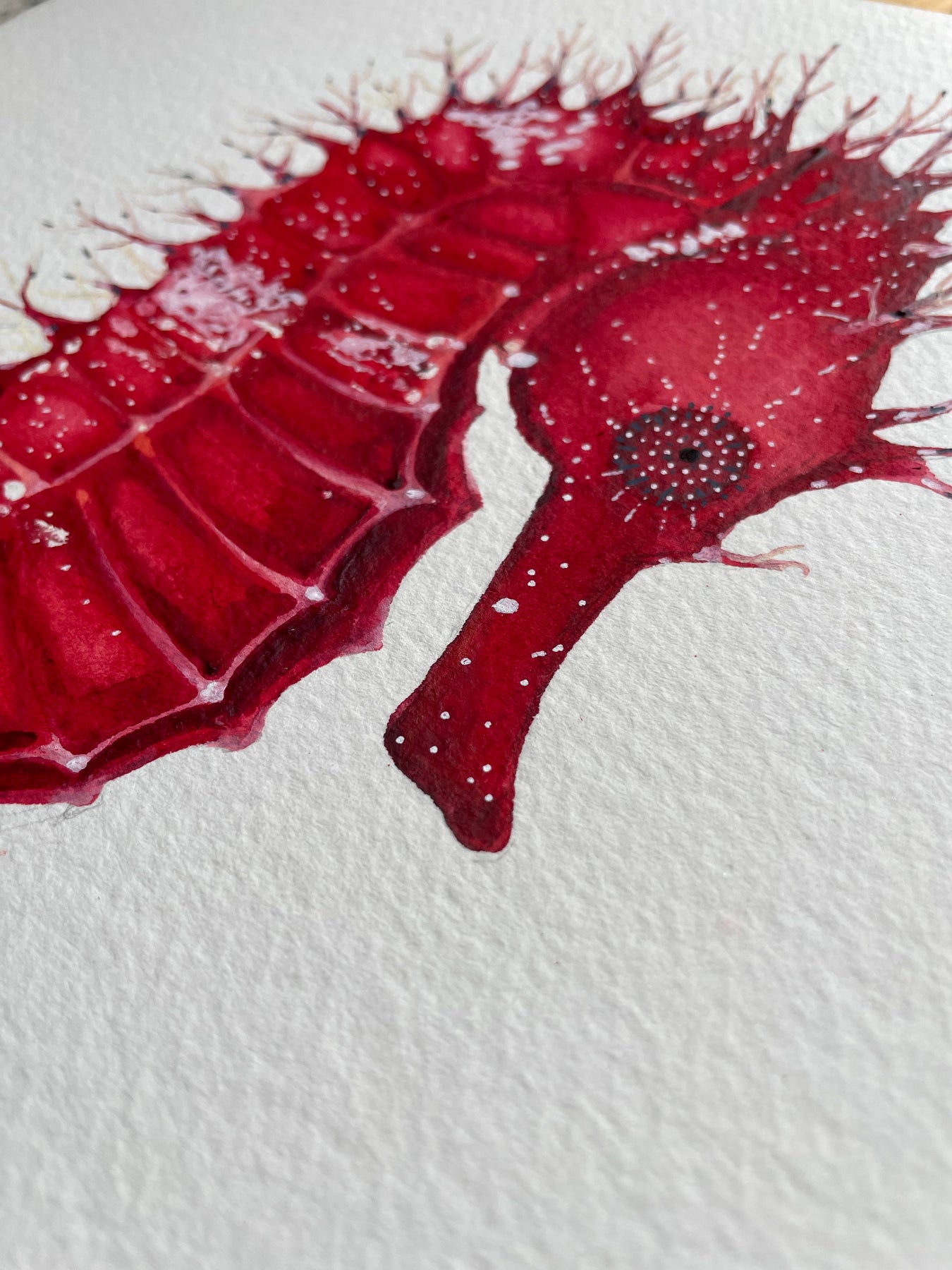 I wanted to capture the essence of the seahorse, evoking a sense of wonder and empathy within the viewer. The contrasting red colour palette against the pure white background highlights the seahorse's internal strength and draws attention to its remarkable beauty. It's a testament to the power of art to create an emotional connection and convey a powerful message.