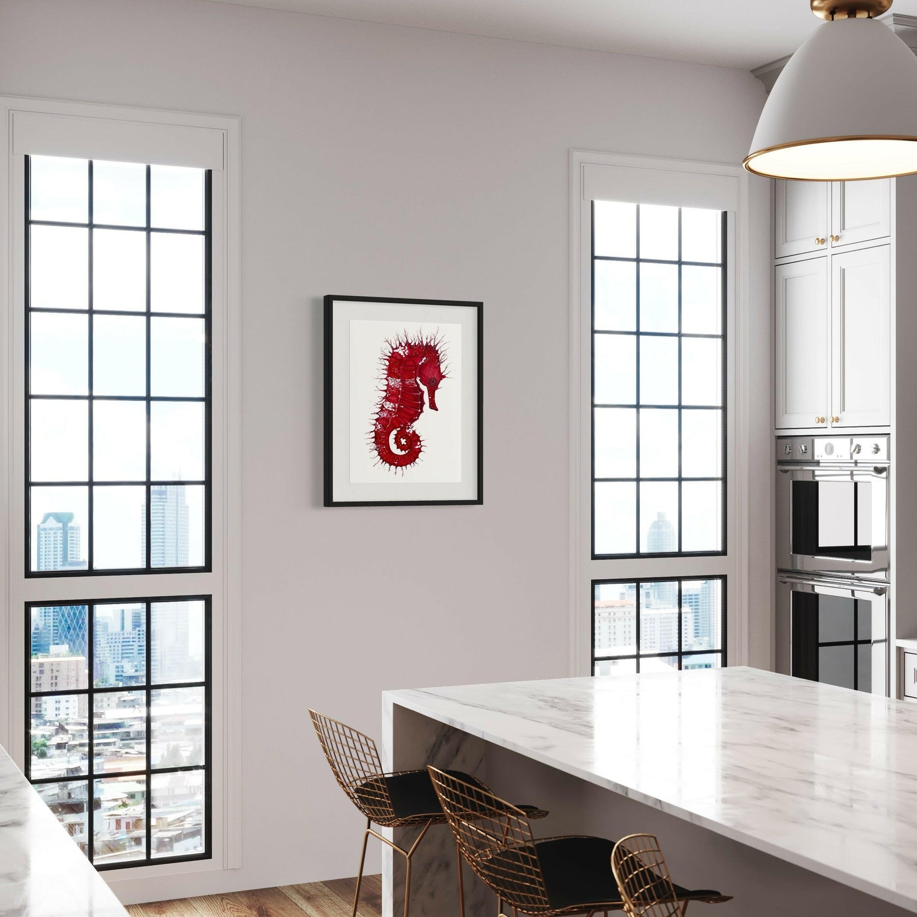 This original artwork, measuring 30cm x 30cm, features a minimalistic white background that provides the perfect backdrop for a seahorse that exudes a vibrant red hue, effortlessly popping off the canvas.